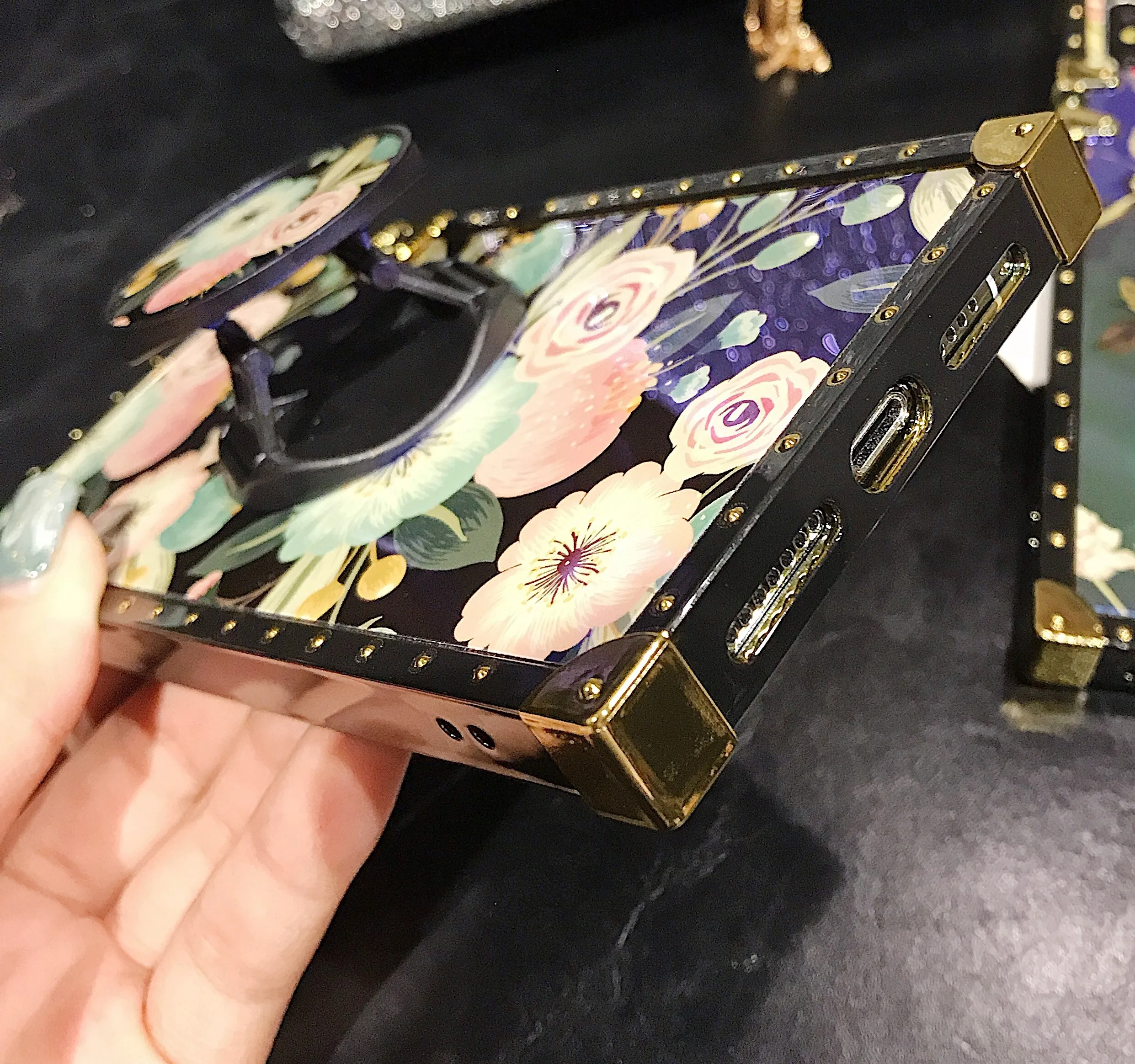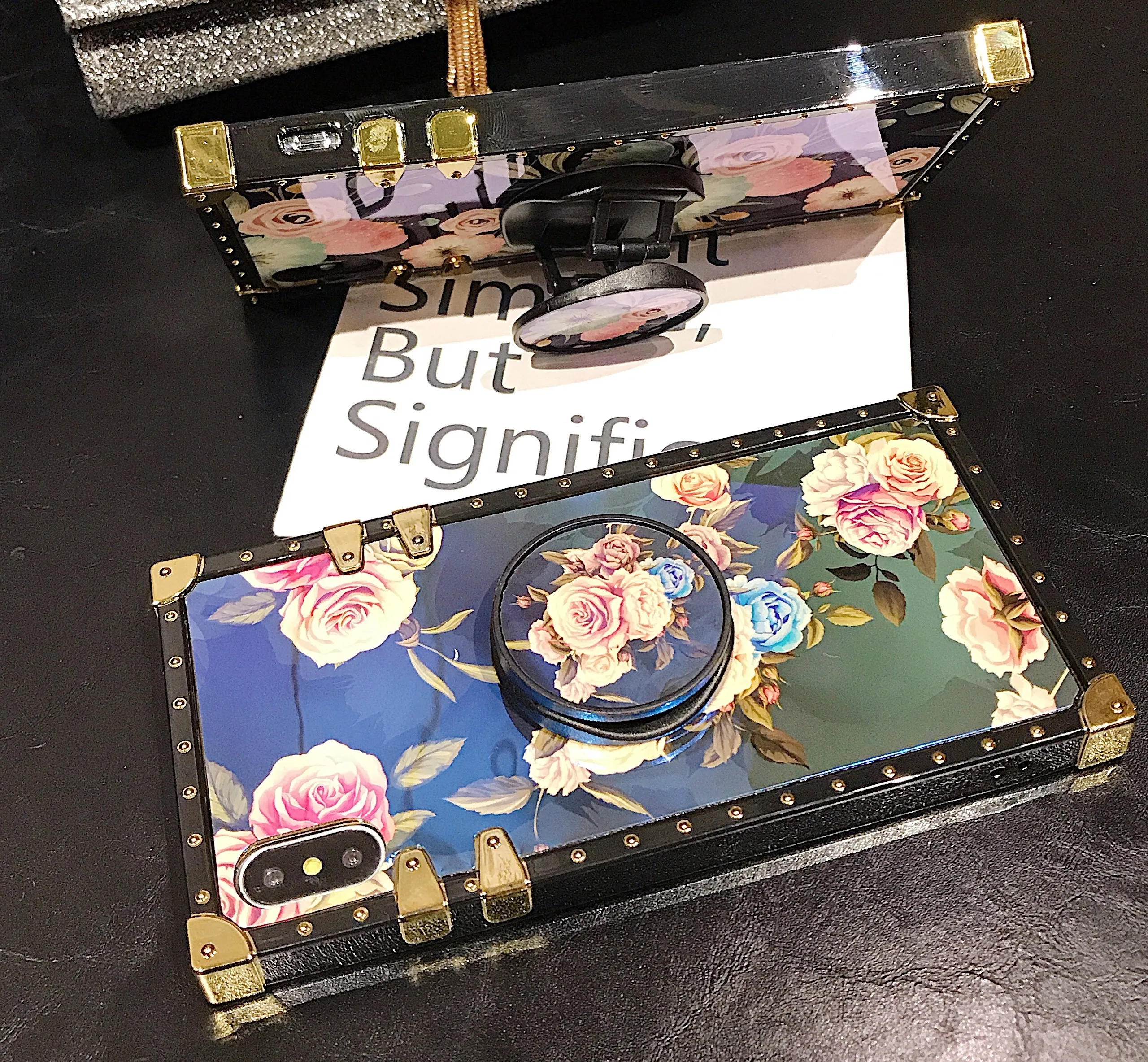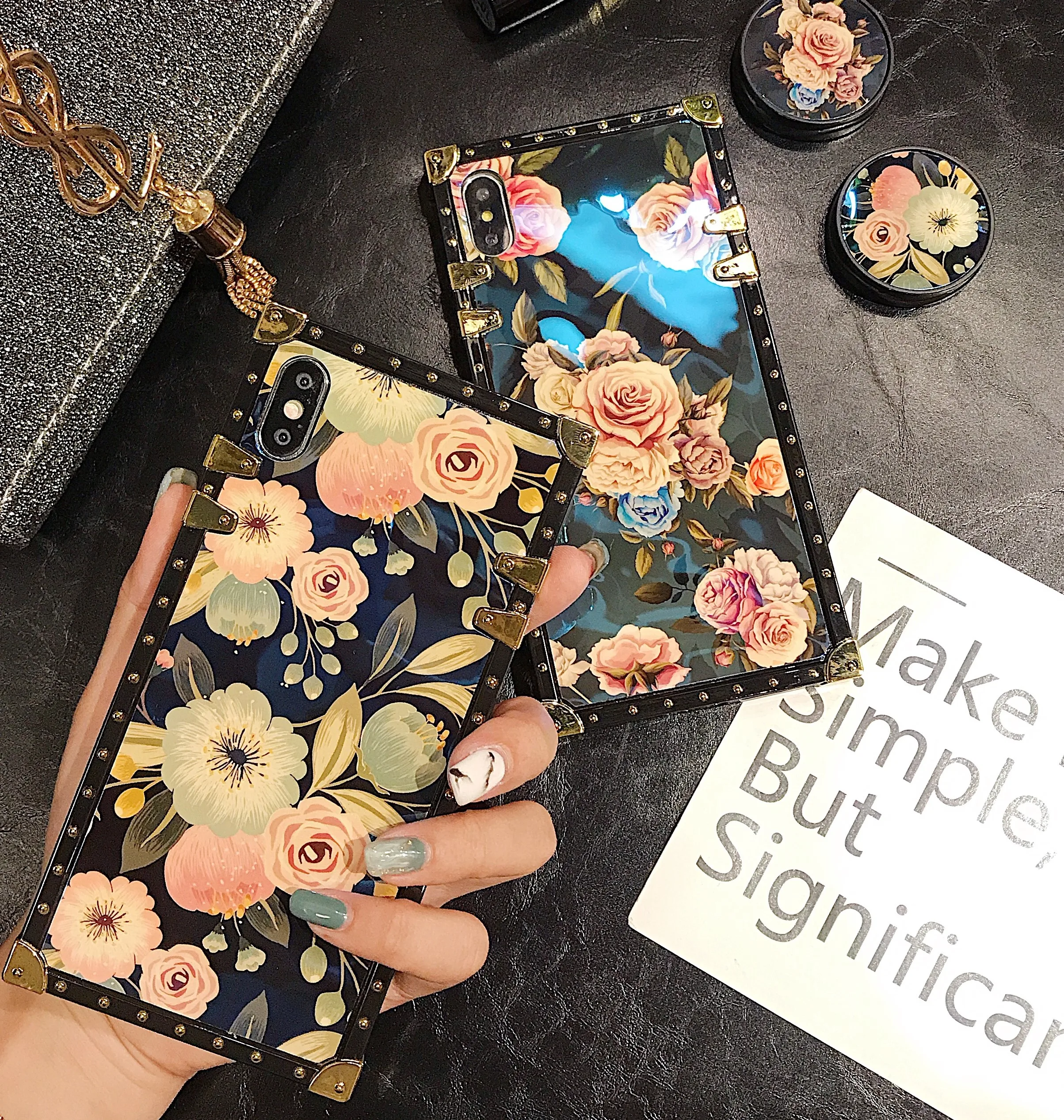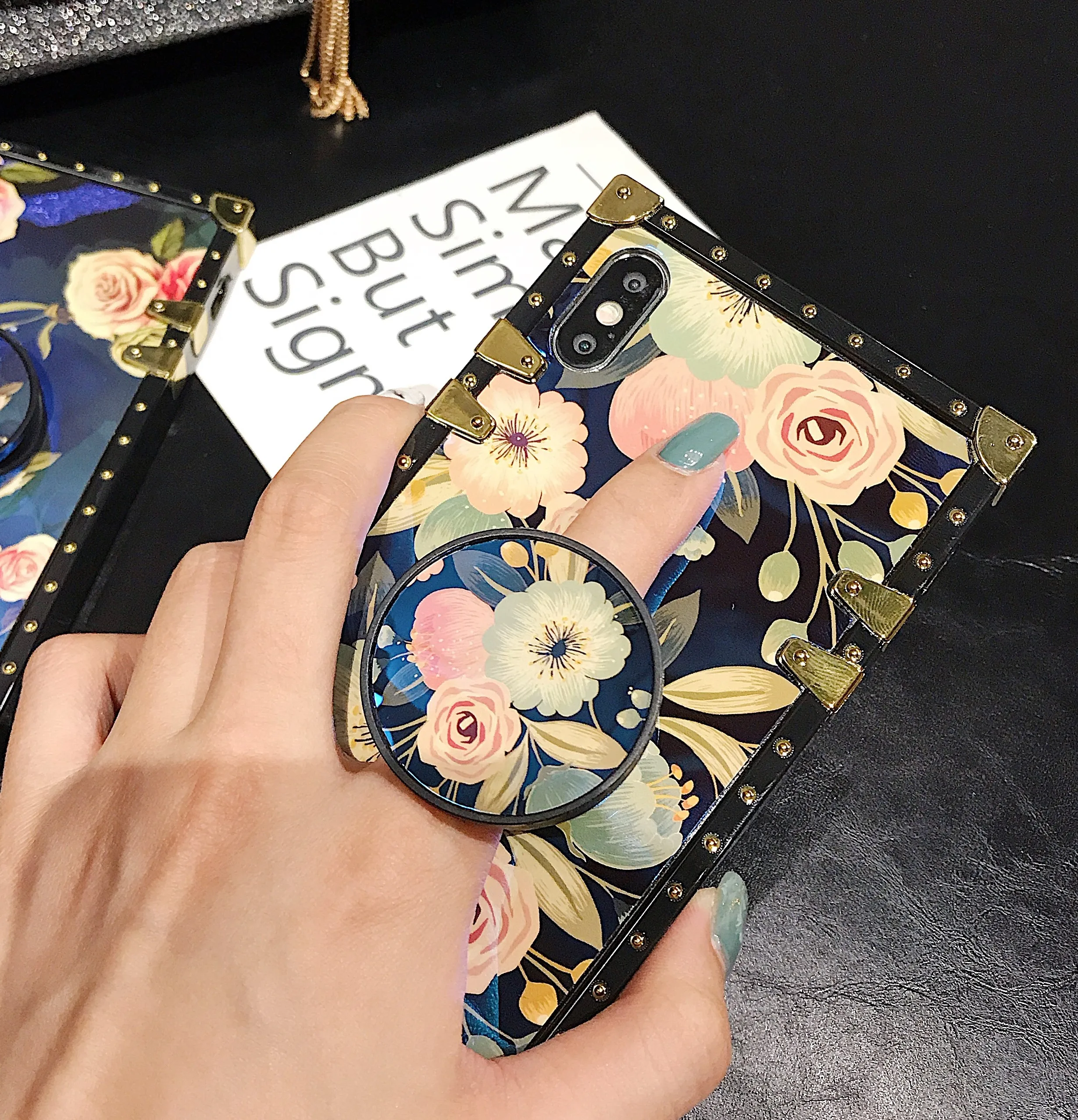 Blue light color phone case Rectangle Square Flower Painting Phone Case with holder For iPhone 11 XS Max XR X 8 7 6 6S Plus
